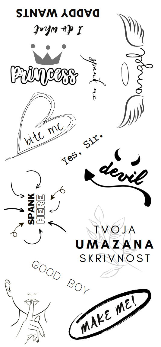 V kompletu zanjo najdete 15 začasnih tattoojev, s katerimi namignete ali pa povsem direktno poveste, kdo je kdo in česa si želite.